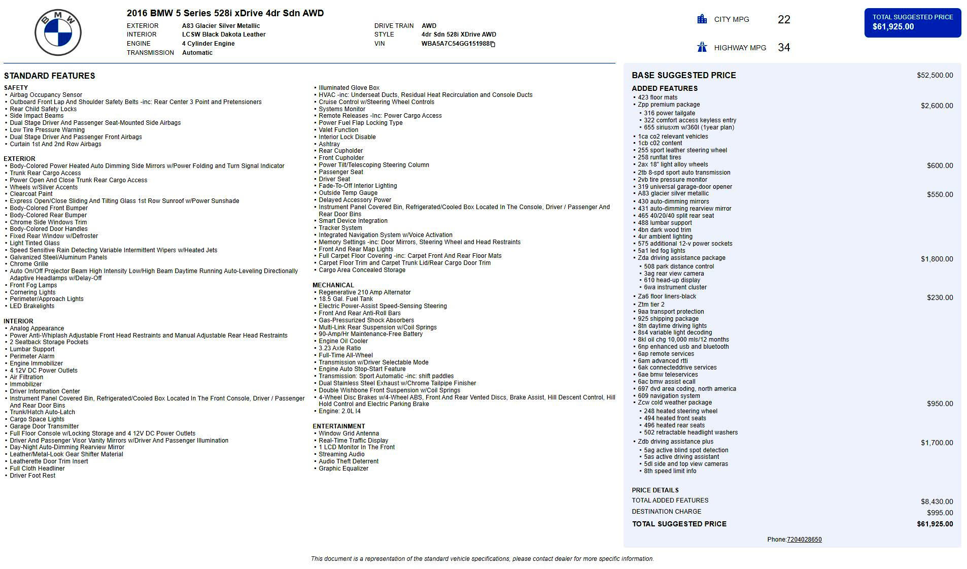 The 2016 BMW 528i xDrive is a luxury midsize sedan that blends sleek styling, advanced technology, and balanced performance. Finished in Glacier Silver Metallic ($550.00) with refined dark wood interior trim, it offers a sophisticated and timeless look.