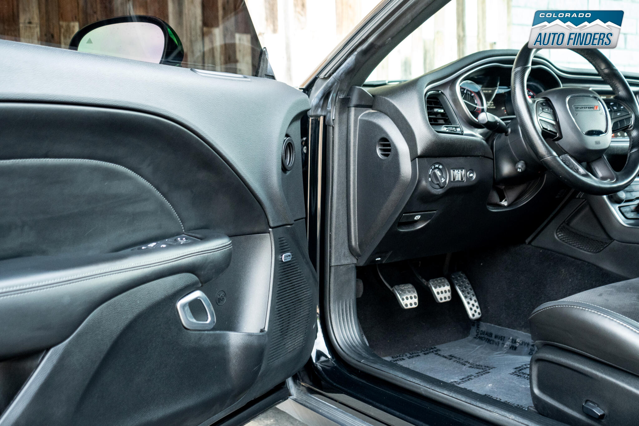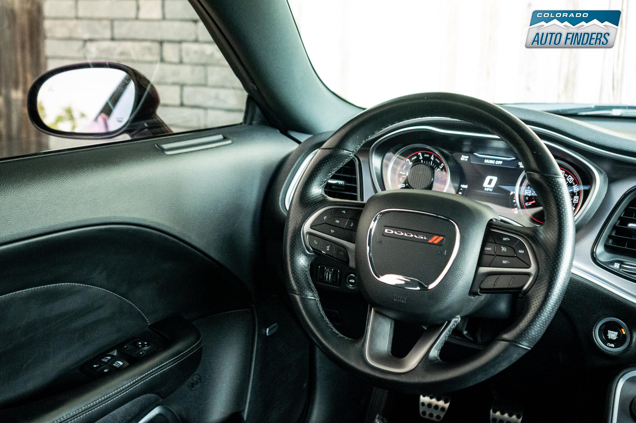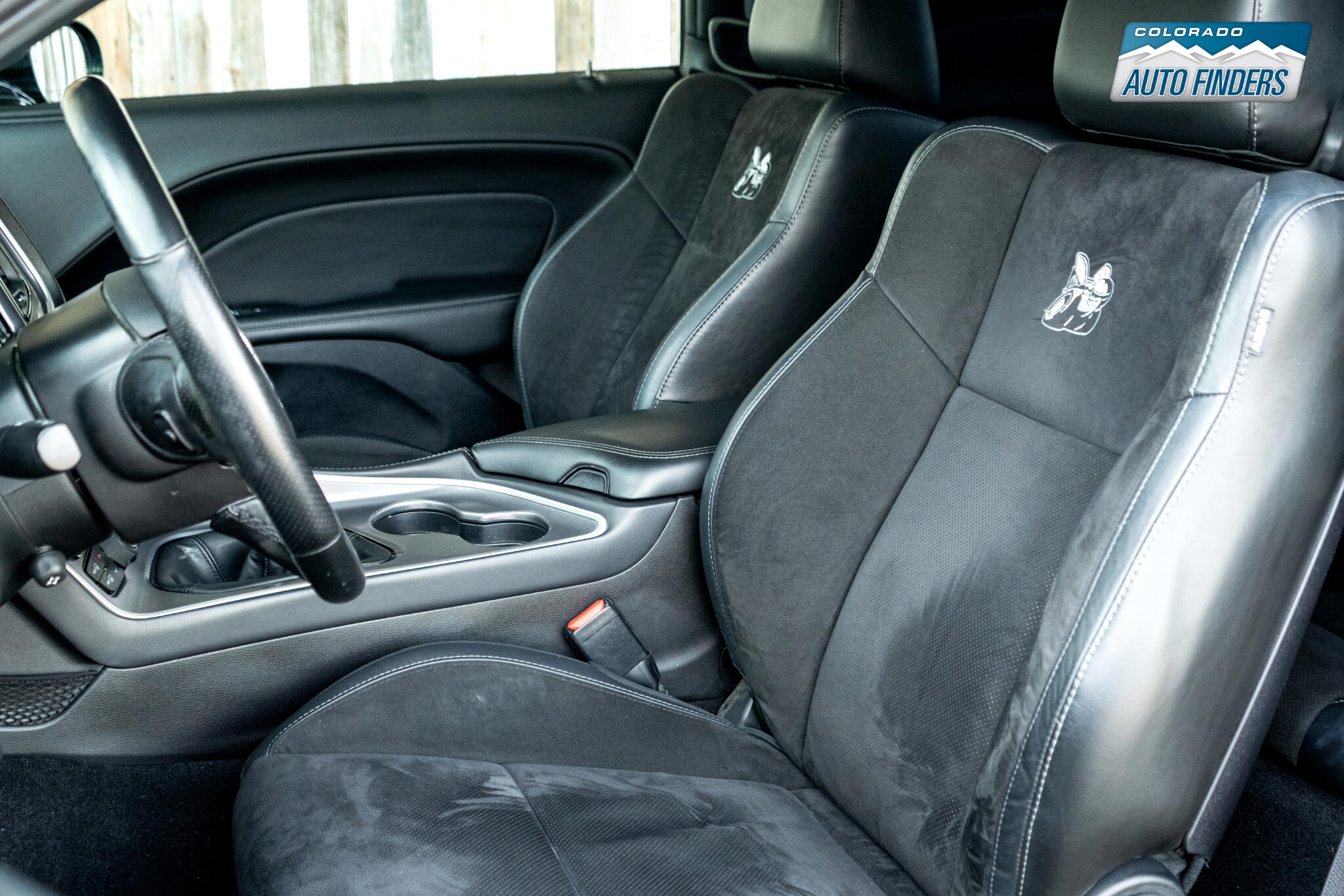 ? **Premium Interior** – **Black leather/Alcantara® seats** with **Scat Pack branding**, heated/ventilated front seats, **Uconnect® 8.4-inch touchscreen**, and **Apple CarPlay®/Android Auto™**.