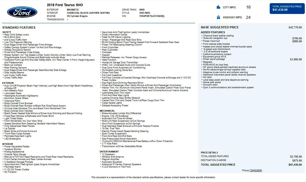 The Driver Assist Package ($1,995.00) adds advanced safety and convenience technologies, including adaptive cruise control with collision warning, lane keep assist with departure warning, and active park assist. These features make the SHO not just powerful, but also smart and safe for daily driving.