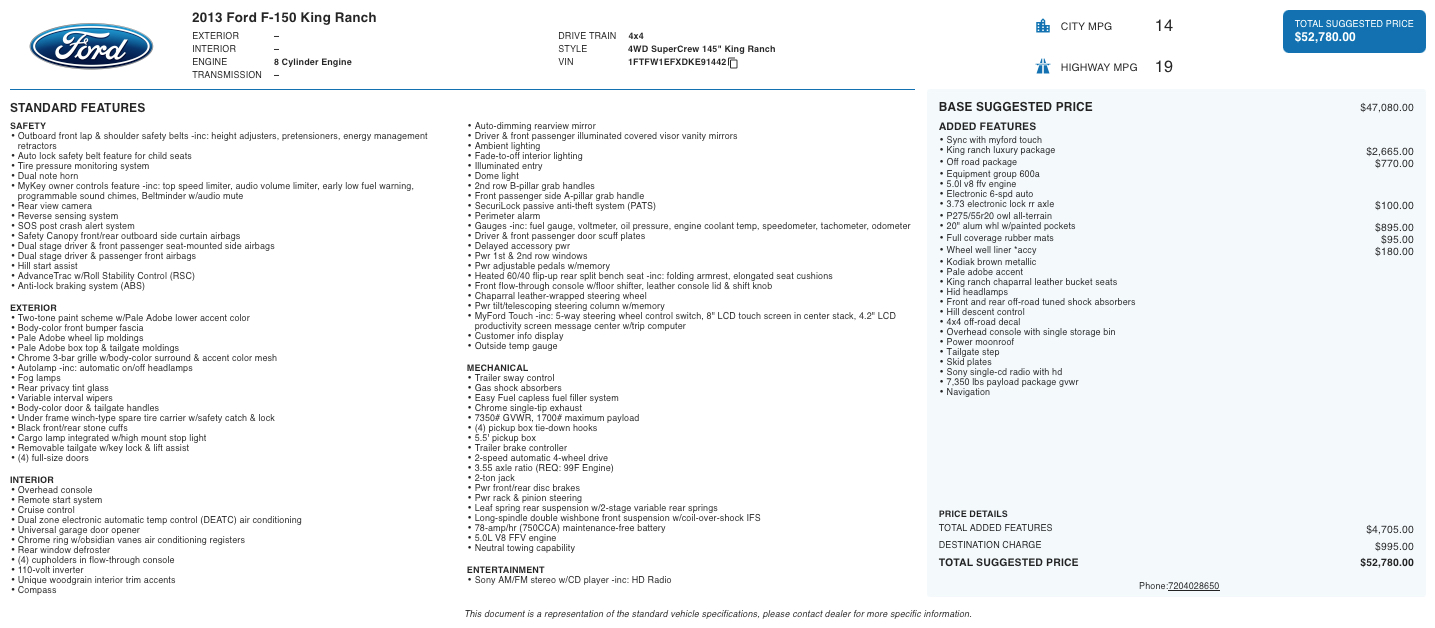 Equipped with the King Ranch Luxury Package, Off-Road Package, and advanced technology like SYNC with MyFord Touch and navigation, this F-150 ensures both driver and passengers enjoy a connected and comfortable ride. Added safety and convenience features, including HID headlamps, skid plates, and hill descent control, make it equally suited for rugged use and daily driving.