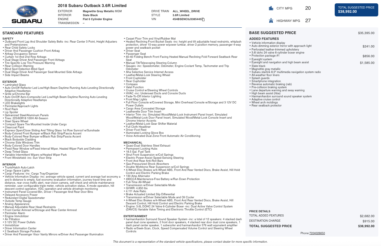 The 2018 Subaru Outback 3.6R Limited blends rugged versatility with upscale comfort. Known for its capable all-wheel drive system and smooth 6-cylinder performance, the Outback 3.6R is ideal for drivers seeking both daily comfort and weekend adventure. Inside, the Limited trim delivers a refined cabin with leather-trimmed upholstery, advanced technology, and safety innovations through Subaru’s EyeSight driver-assist system.
