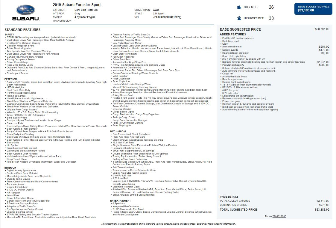 The 2019 Subaru Forester Sport delivers confident all-weather performance and everyday versatility backed by Subaru’s legendary reliability. Powered by a 2.5L DOHC Boxer engine paired with a Lineartronic CVT, this Forester offers smooth efficiency, strong low-end torque, and Subaru Symmetrical All-Wheel Drive for exceptional traction on snow-covered roads, mountain passes, and rough terrain. Paddle-shift control switches provide a more engaging driving feel when you want added control.