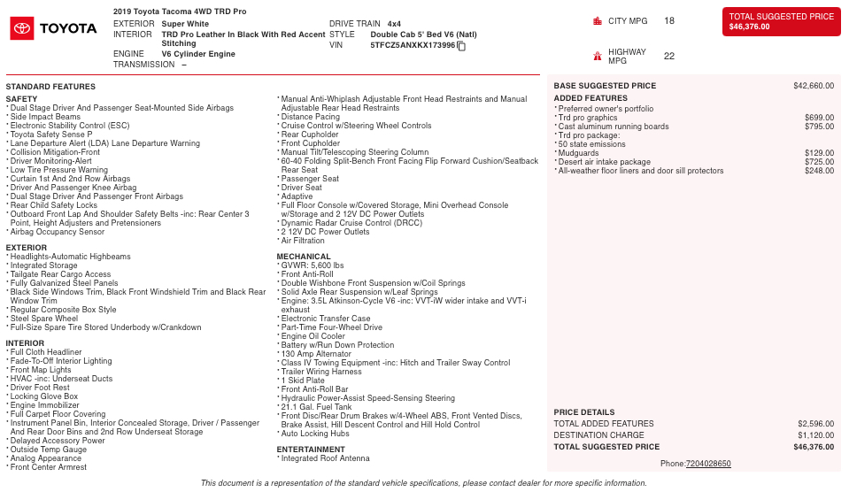 This 2019 Toyota Tacoma TRD Pro in Super White is the ultimate off-road-ready midsize truck, engineered for capability, durability, and rugged adventure. Powered by a 3.5L V6 and paired with a 4x4 drivetrain, the TRD Pro delivers strong performance on pavement and confidence on trails thanks to its specially tuned suspension, FOX internal-bypass shocks, skid plates, and off-road traction systems. Its bold stance is enhanced by TRD Pro graphics, cast-aluminum running boards, unique black-accented styling, and an aggressive grille design that makes this Tacoma instantly recognizable. The Desert Air Intake Package adds both functionality and presence, helping improve airflow in dusty off-road environments while giving the truck a distinctive expedition-ready look.