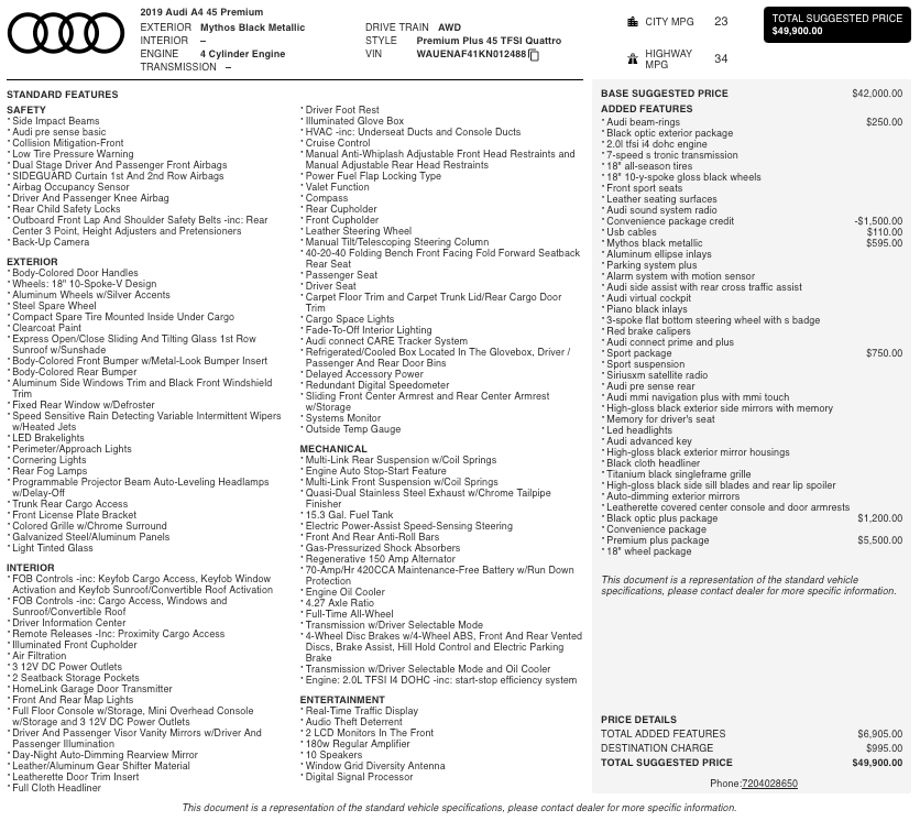 This 2019 Audi A4 45 Premium Plus quattro is a refined luxury sedan that blends confident all-wheel-drive performance with modern technology and premium comfort. Finished in Mythos Black Metallic with a black interior, this A4 delivers a clean, sophisticated design paired with Audi’s signature quattro all-wheel drive system.
