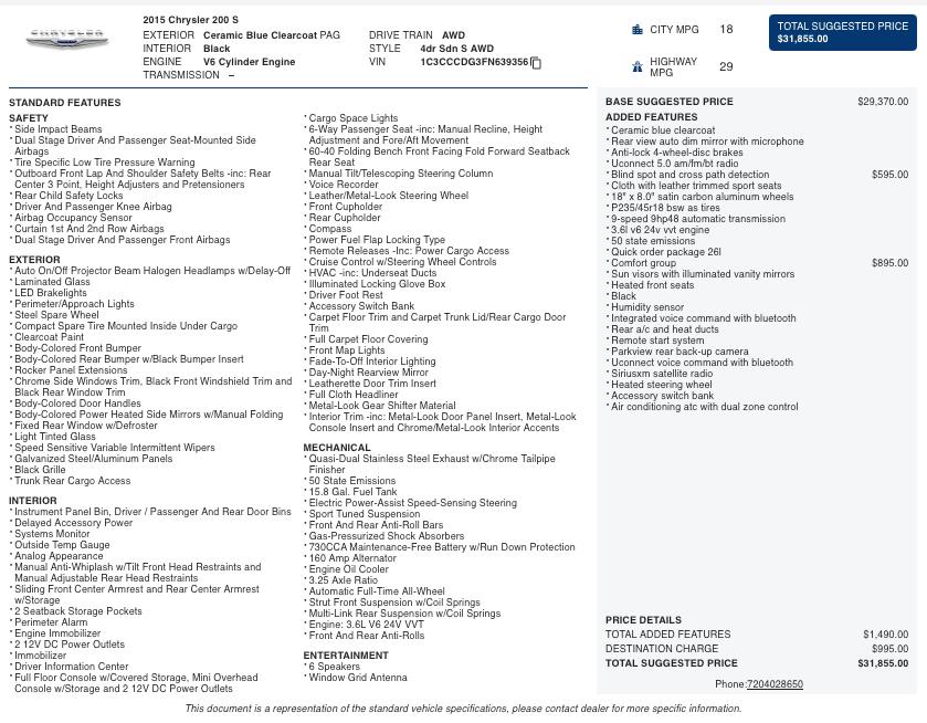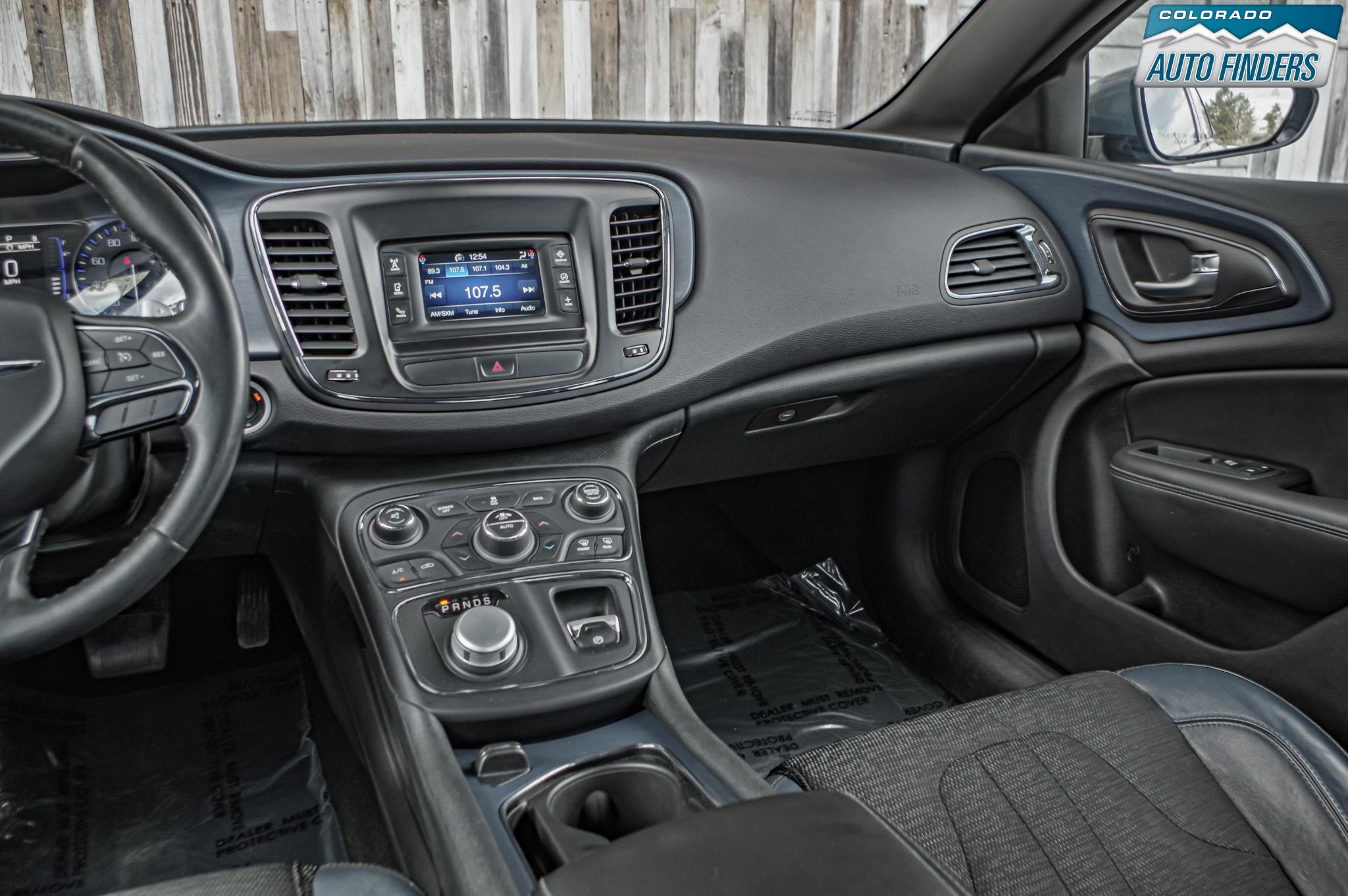 Equipped with the Comfort Group, this Chrysler 200 S features heated front seats, a heated steering wheel, remote start, and dual-zone automatic climate control for year-round comfort. Technology highlights include the Uconnect infotainment system with Bluetooth connectivity, voice command, and a premium audio system. Additional features such as a backup camera, keyless entry with push-button start, and sport cloth/leather-trimmed seats enhance convenience and style.