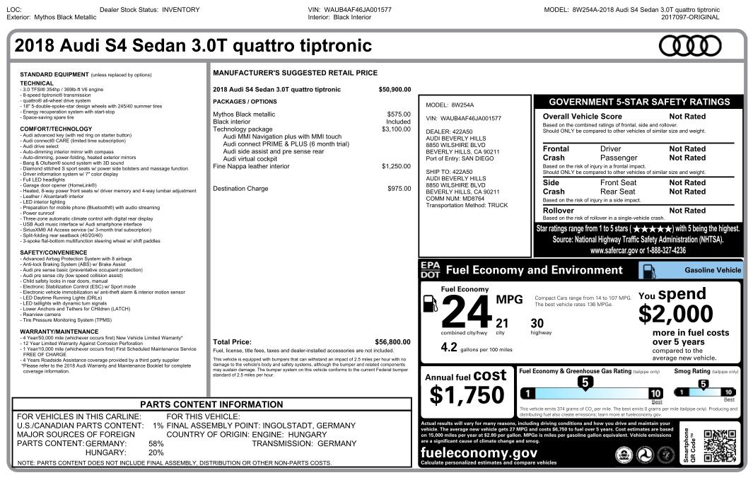 Precision engineering meets refined sport performance in this 2018 Audi S4 Sedan 3.0T quattro finished in Mythos Black Metallic over a Black interior. Blending aggressive performance with everyday luxury, the S4 is a standout in the sport sedan segment and a perfect fit for Colorado driving with its legendary quattro all-wheel drive system.