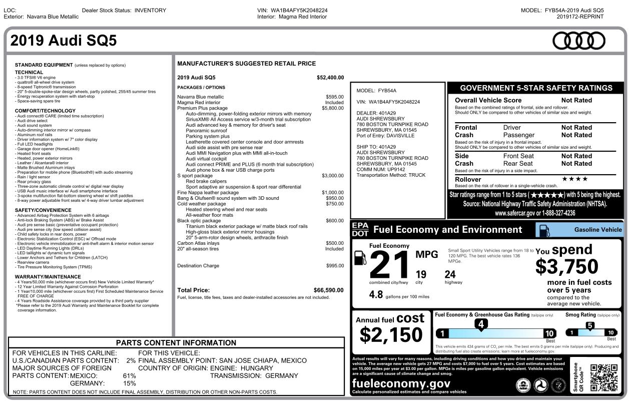 Performance SUV capability meets unmistakable Audi sport styling in this 2019 Audi SQ5 finished in Navarra Blue Metallic over a striking Magma Red interior. With its aggressive design, turbocharged power, and premium technology, the SQ5 delivers the perfect blend of luxury, performance, and everyday versatility.