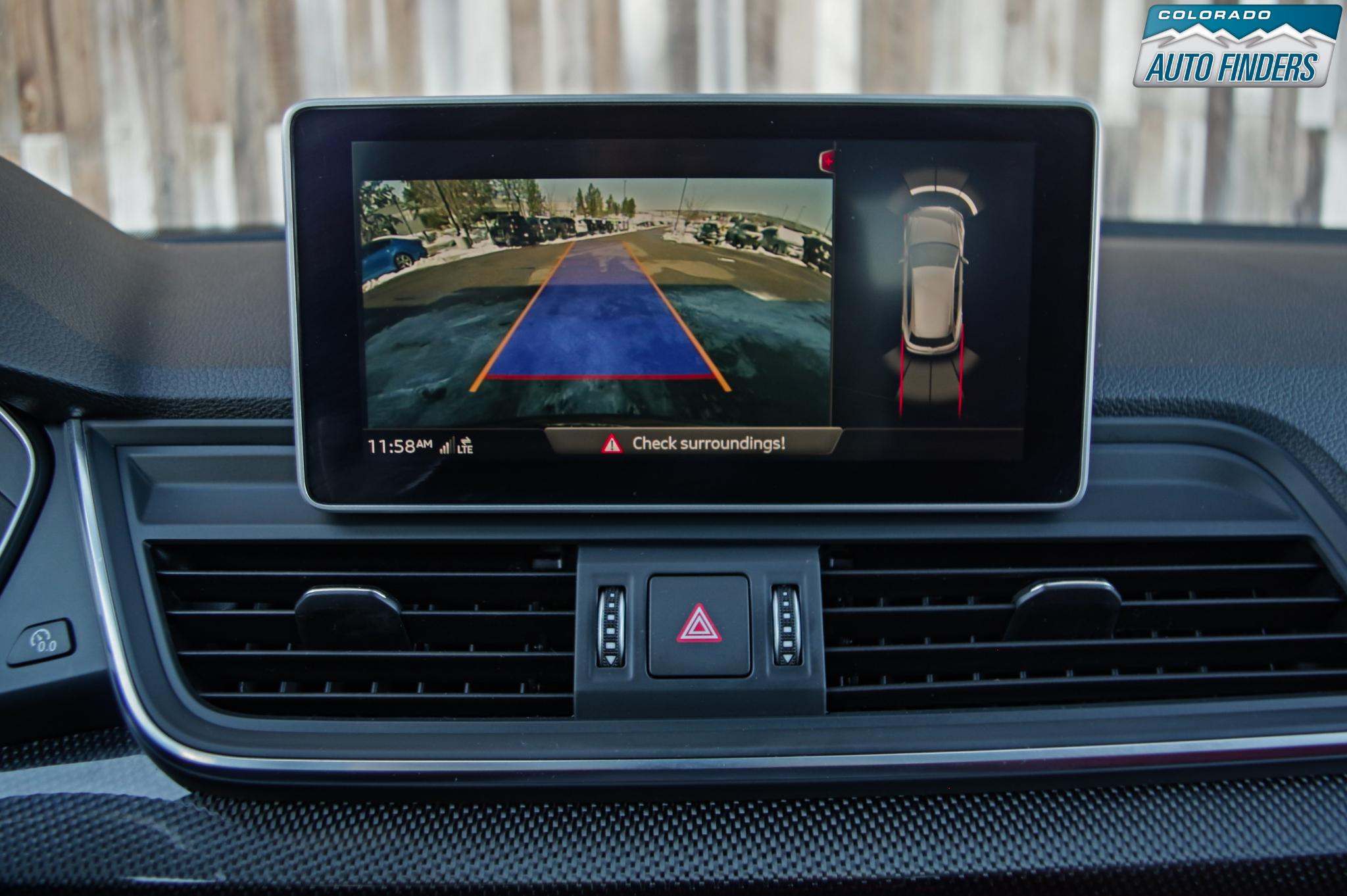 Additional highlights include the Black Optic Package with titanium black exterior accents, 20-inch alloy wheels, LED headlights with dynamic indicators, parking system plus with rearview camera, and Audi advanced key with push-button start.