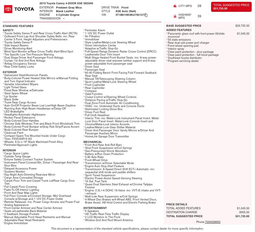 Enjoy sporty styling, impressive efficiency, and legendary Toyota reliability with this 2019 Toyota Camry XSE, a midsize sedan that blends performance-inspired design with everyday comfort and advanced technology. Powered by a responsive 2.5-liter 4-cylinder engine paired with an 8-speed automatic transmission, this Camry delivers smooth acceleration while achieving excellent fuel economy, making it an ideal choice for commuting or road trips.