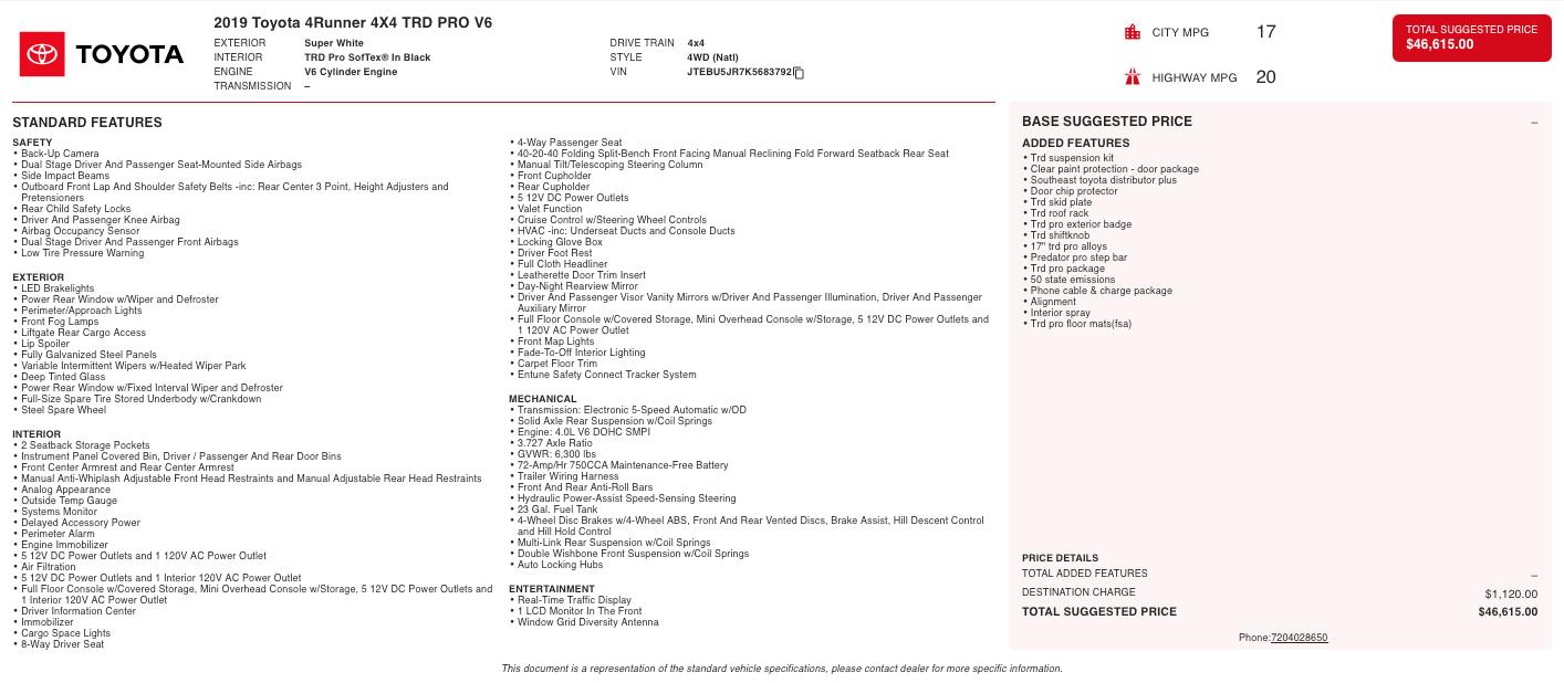 Trail-ready capability meets legendary Toyota reliability in this 2019 Toyota 4Runner TRD Pro 4x4 finished in rare Super White over a TRD Pro SofTex interior in Black. Built for serious off-road performance and long-term durability, the TRD Pro stands at the top of the 4Runner lineup and is one of the most sought-after SUVs for both adventure and everyday driving.