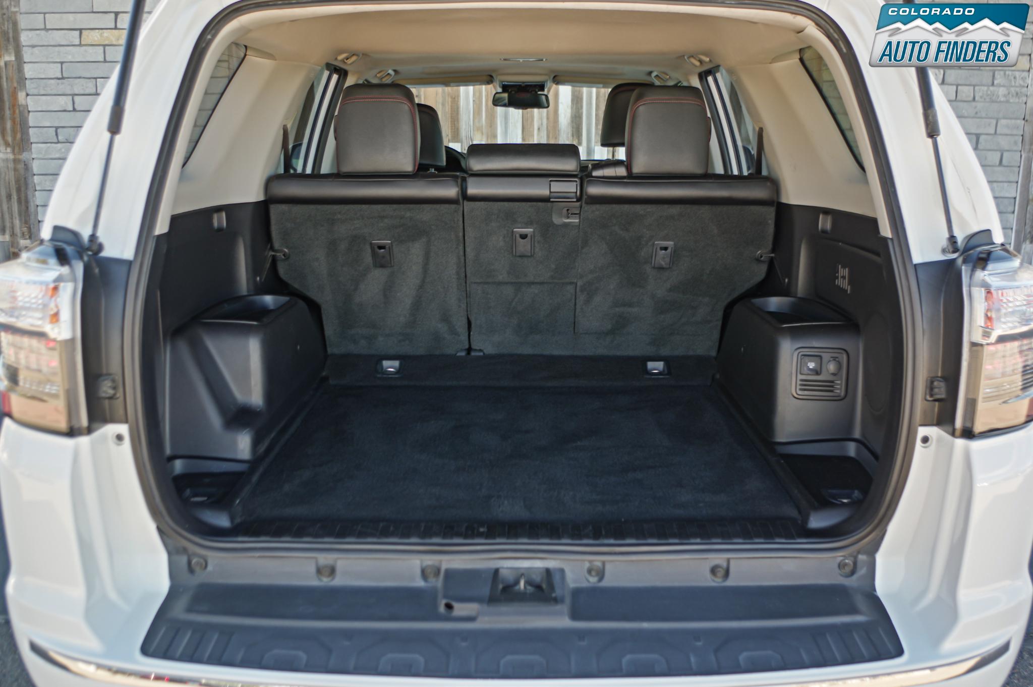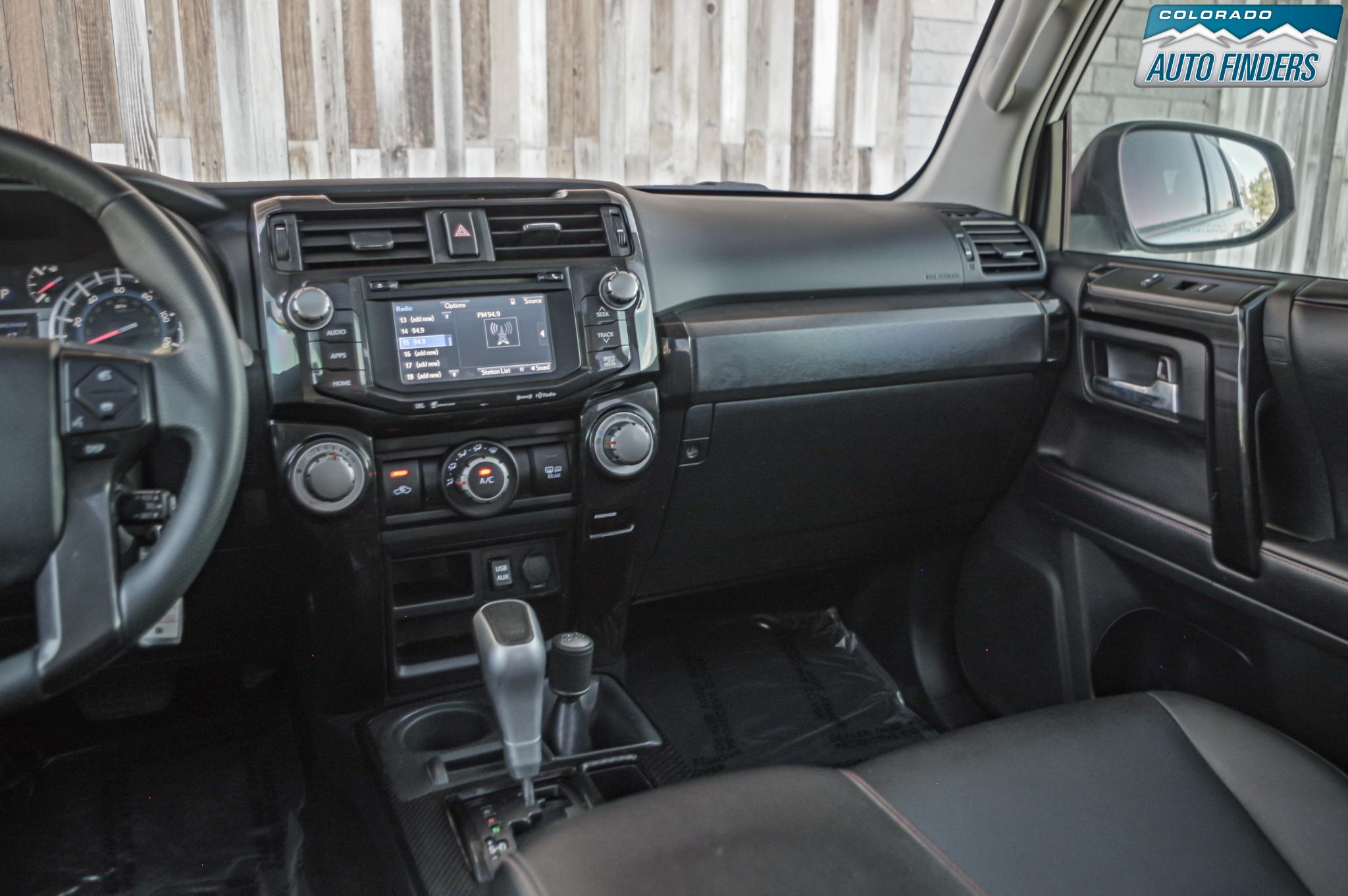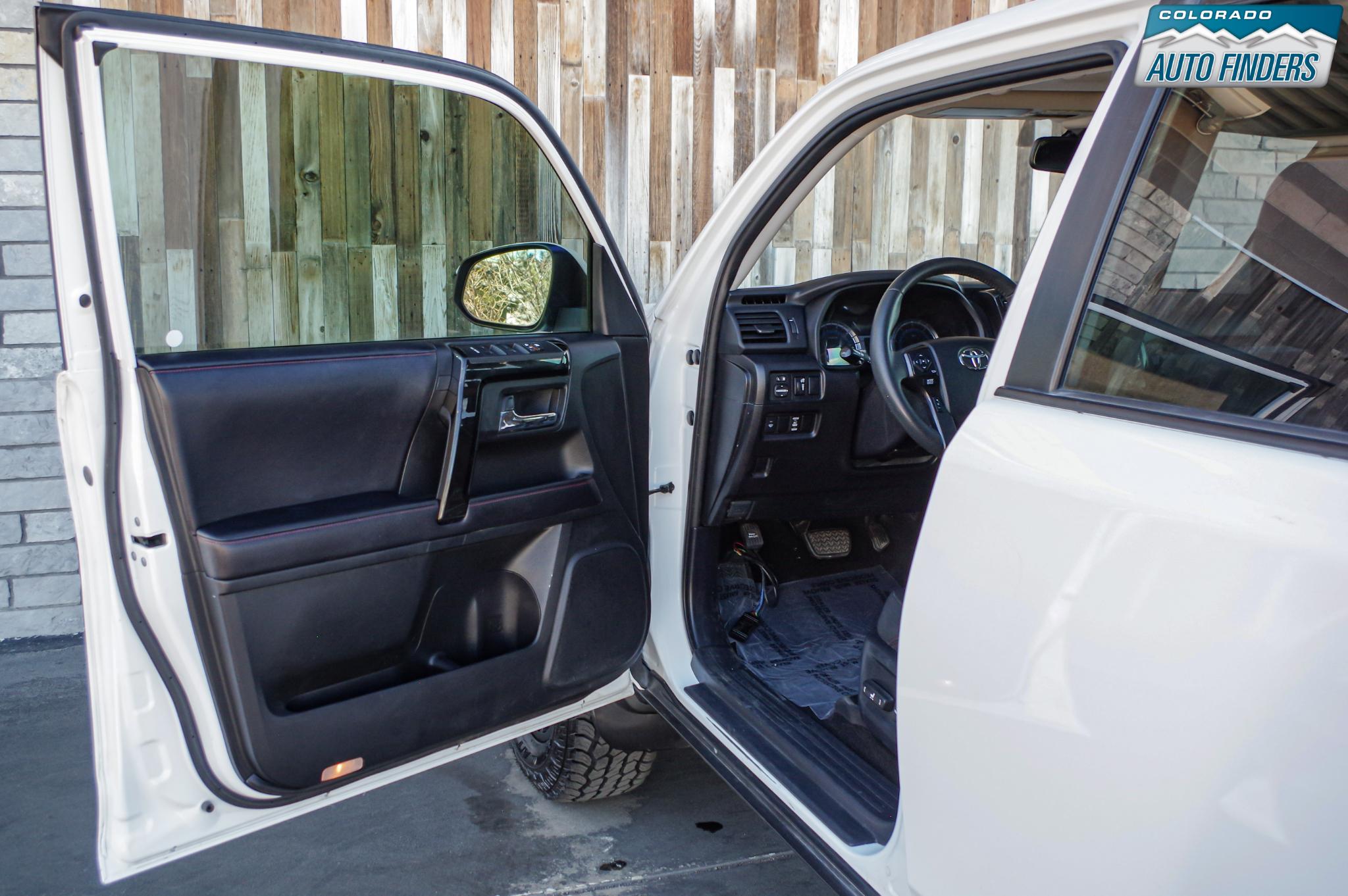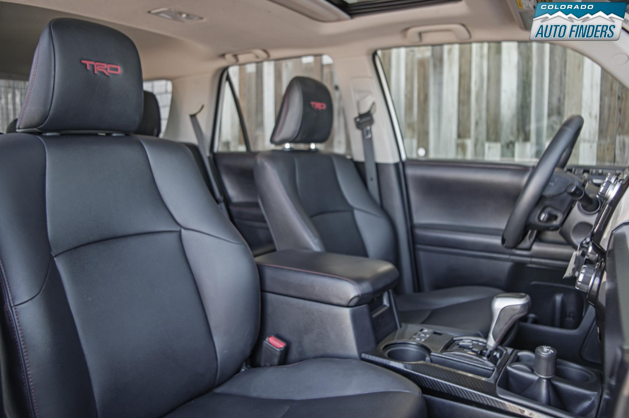 Inside, the cabin is designed for durability and function with TRD Pro SofTex seating, power-adjustable front seats, a leather-wrapped steering wheel, and a spacious layout with fold-flat rear seating for added cargo versatility. Technology features include Entune infotainment, navigation capability, Bluetooth connectivity, and a premium audio system.