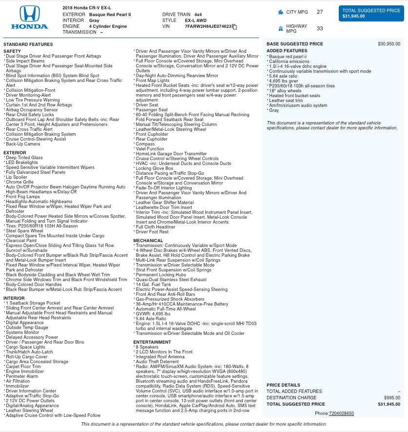 Enjoy comfort, efficiency, and versatility in this 2018 Honda CR-V EX-L AWD, a compact SUV known for its reliability, advanced safety technology, and everyday practicality. Powered by a responsive 1.5-liter turbocharged 4-cylinder engine paired with a continuously variable transmission and Real Time AWD, this CR-V delivers confident performance with excellent fuel economy for commuting, road trips, and Colorado weather conditions.