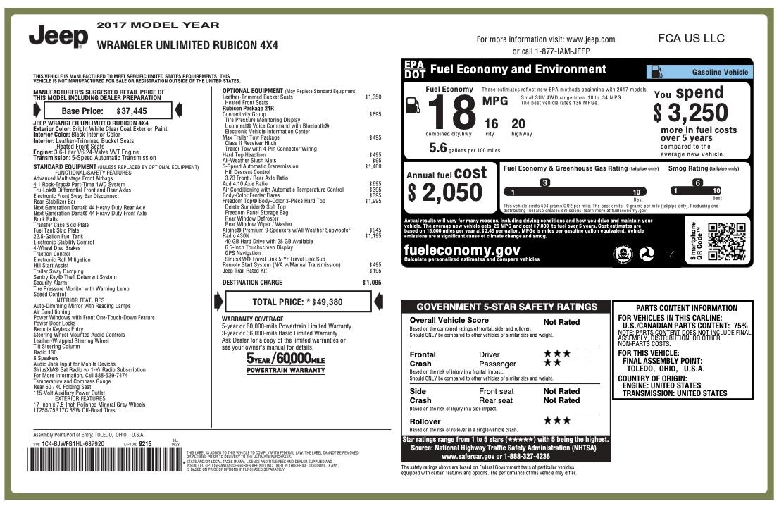Adventure-ready and instantly recognizable, this 2017 Jeep Wrangler Unlimited Rubicon 4x4 stands out in Bright White Clear Coat over a Black interior with the right mix of off-road hardware, premium comfort, and desirable factory options. Built for serious trail work but still easy to enjoy around town, this Rubicon brings the rugged capability Jeep is known for with a clean, high-demand look.