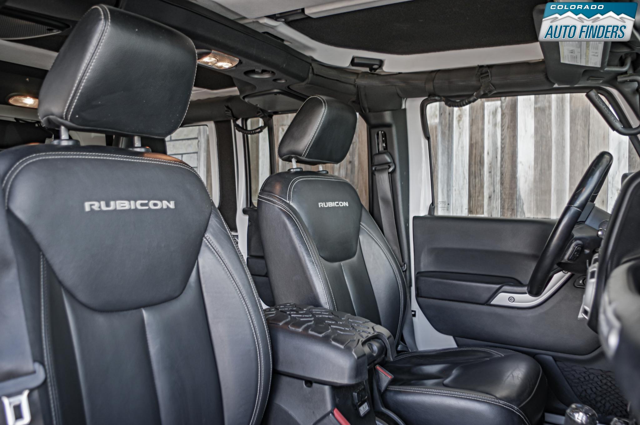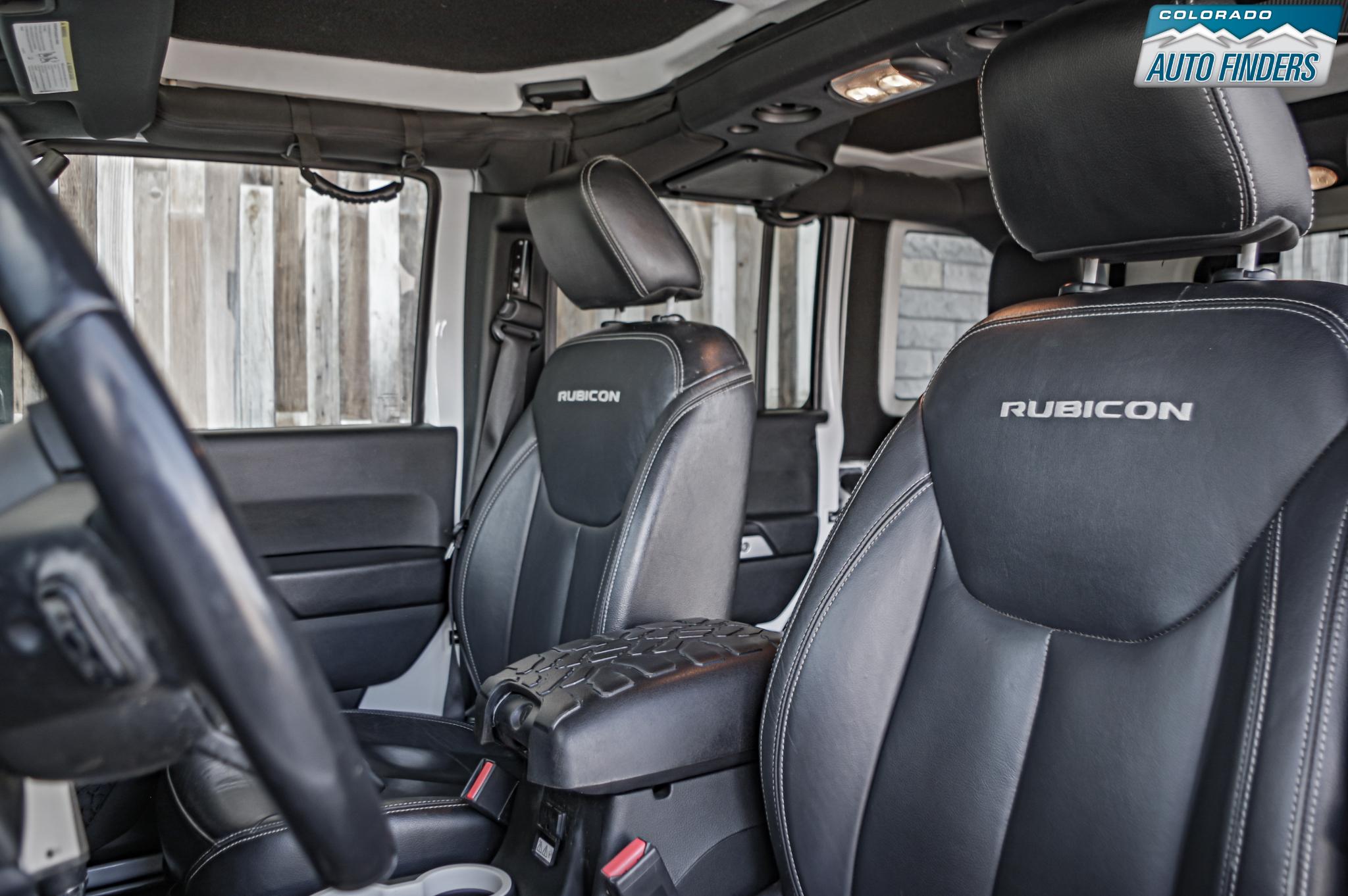Factory equipment includes leather-trimmed heated front bucket seats, Connectivity Group, Uconnect Voice Command with Bluetooth, tire pressure monitoring display, Alpine premium audio with all-weather subwoofer, 430N navigation, remote start, Max Tow Package, Class II receiver hitch, trailer tow wiring, hard top headliner, and body-color Freedom Top panels with rear defroster and wiper. Bright White paint paired with body-color fender flares and the color-matched hardtop gives this Rubicon a sharp, upscale look that still feels every bit Jeep.