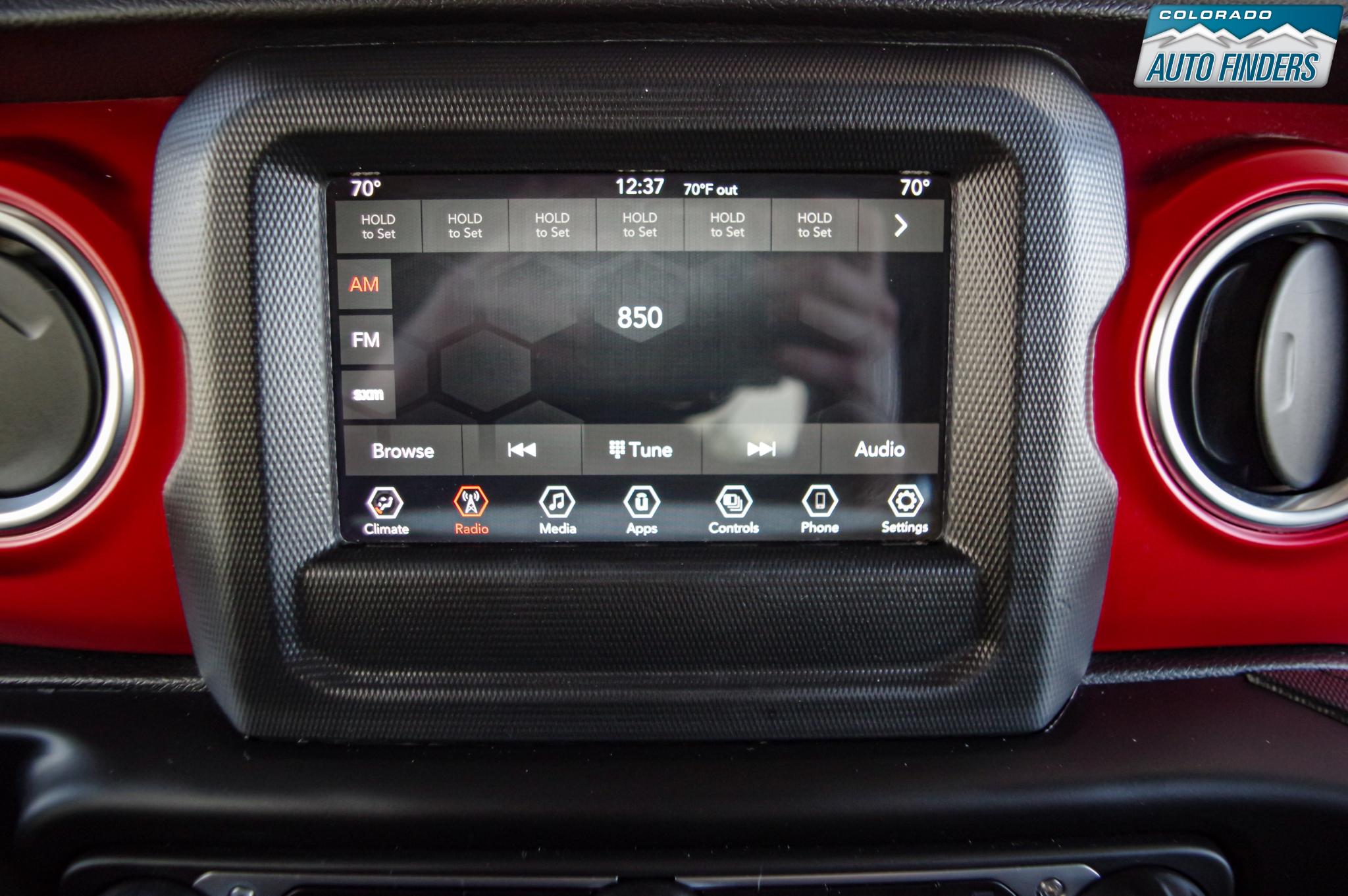 Inside, the cabin blends rugged design with modern connectivity. Features include the Uconnect infotainment system with Apple CarPlay and Android Auto compatibility, Bluetooth connectivity, voice command capability, and steering wheel-mounted controls. The interior also includes air conditioning, power windows and locks, push-button start, and a driver information display for added convenience.