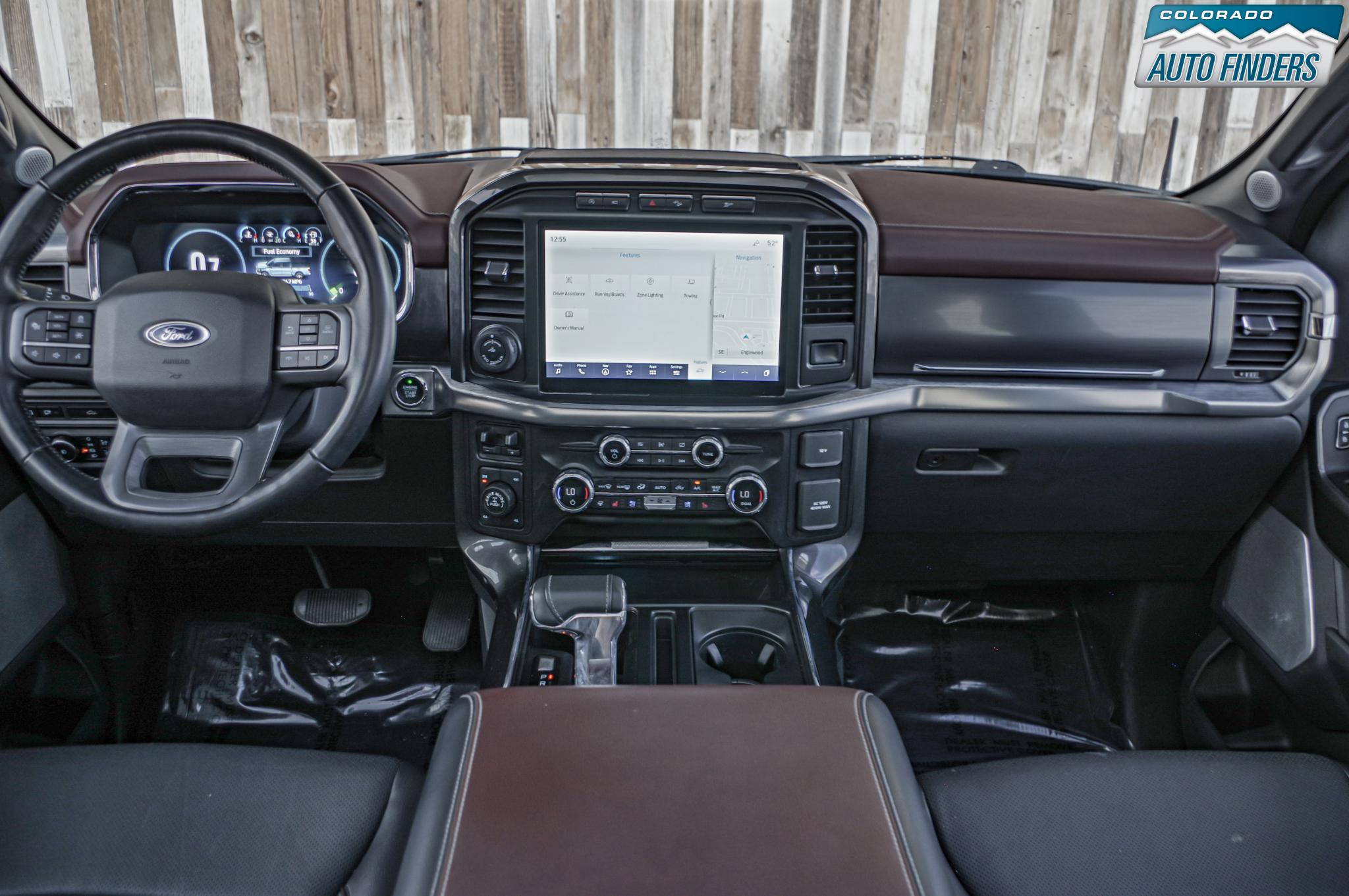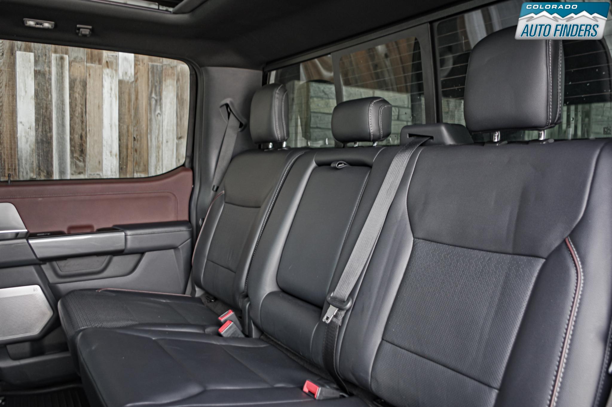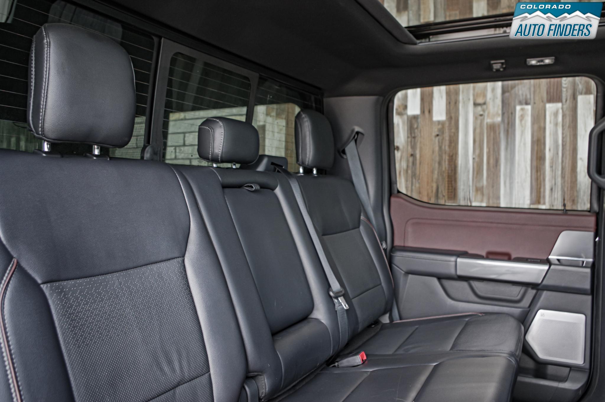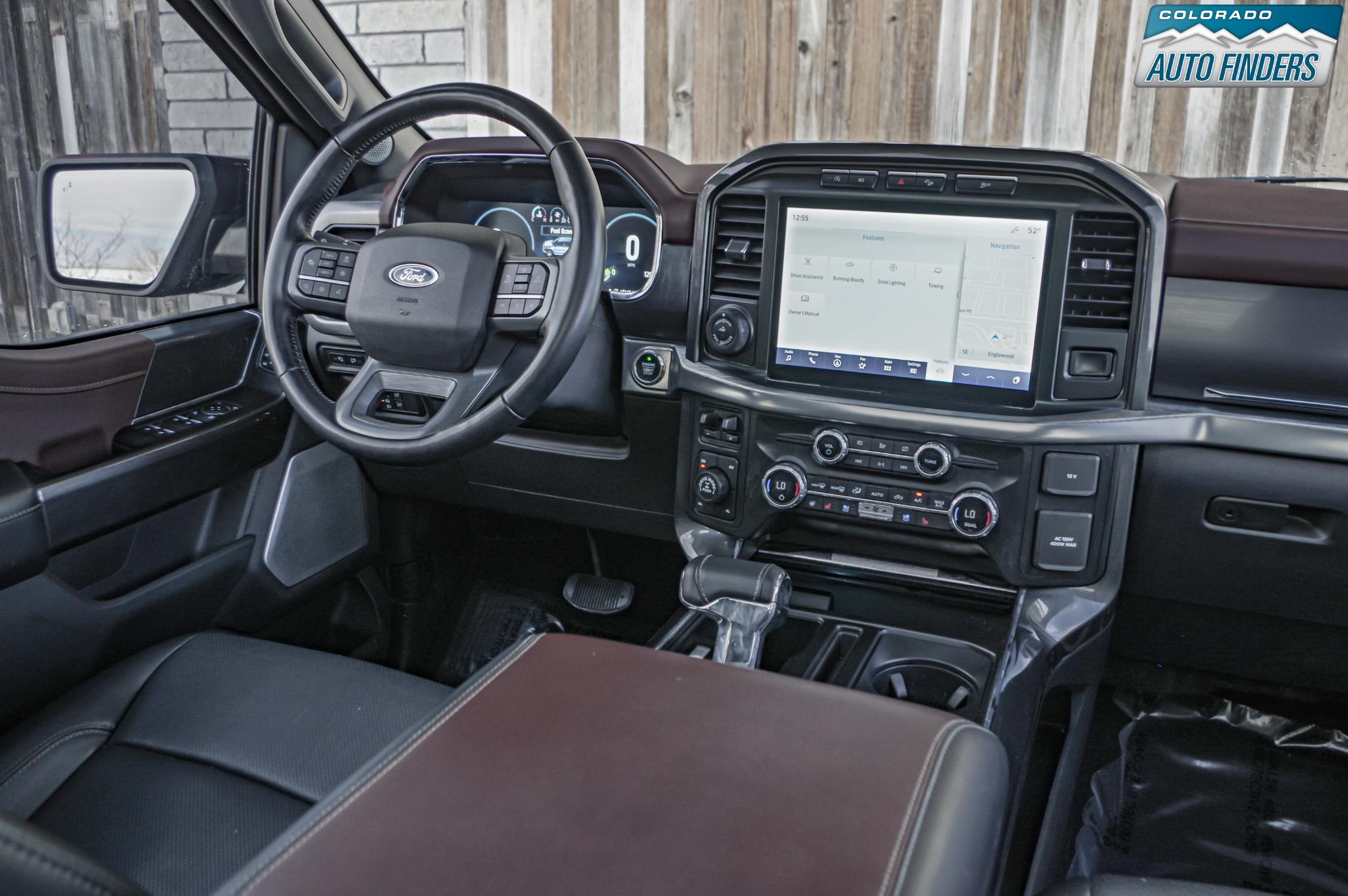 The Lariat trim elevates the interior with leather-trimmed bucket seats, a large 12-inch productivity screen, SYNC 4 infotainment with enhanced voice recognition, and a premium B&O sound system. Comfort and convenience features include heated and ventilated front seats, dual-zone automatic climate control, power-adjustable pedals, remote start, push-button start, and a power sliding rear window.