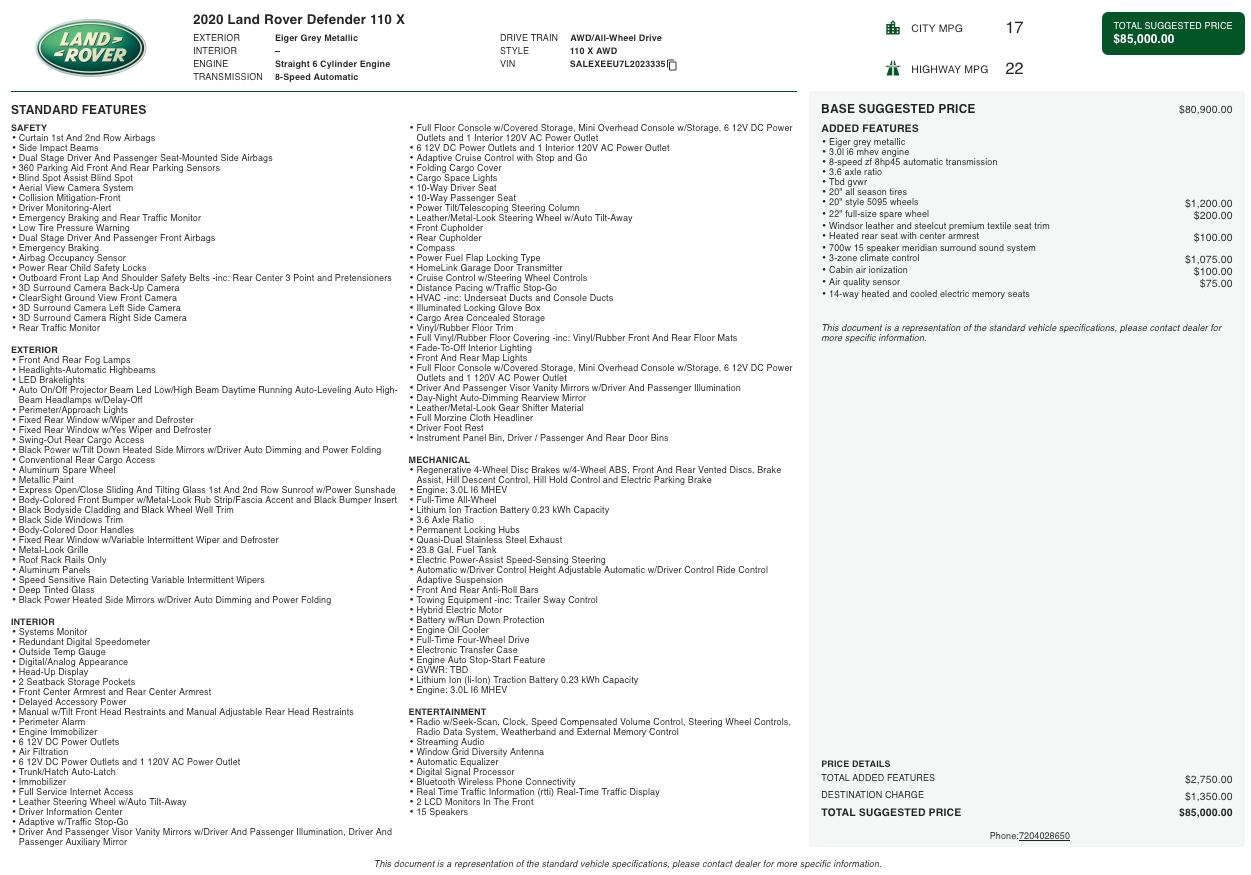 Luxury off-road capability meets modern engineering in this 2020 Land Rover Defender 110 X AWD finished in striking Eiger Grey Metallic over a premium tan leather interior with black trim. Combining iconic Defender heritage with advanced hybrid turbocharged performance, cutting-edge technology, and true go-anywhere capability, this Defender 110 X stands out as one of the most sought-after luxury SUVs for both daily driving and off-road adventure.