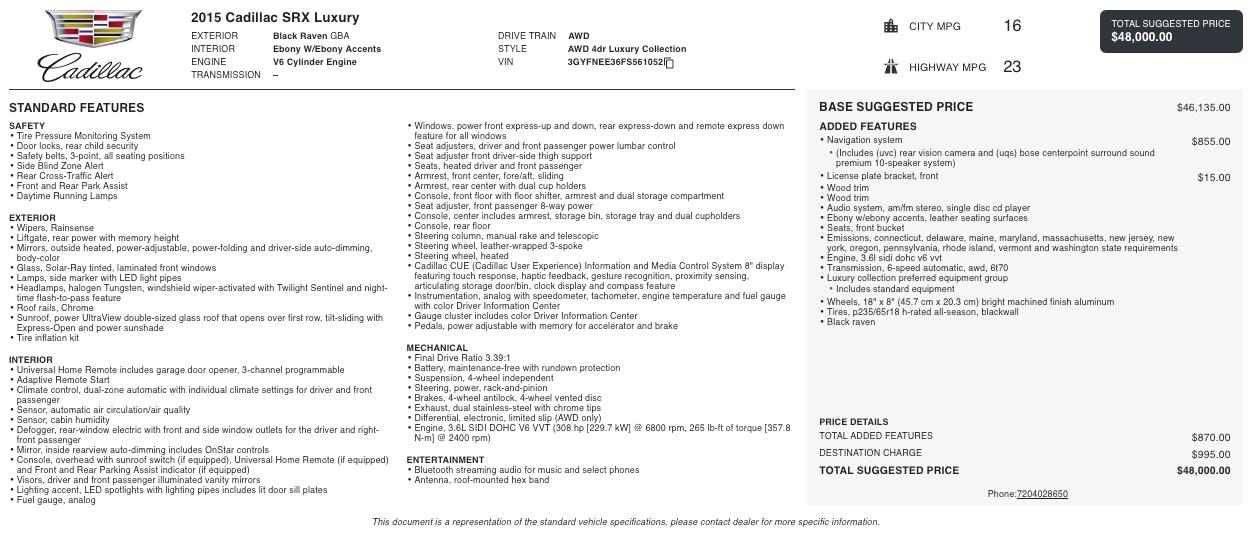 This SRX Luxury Collection comes well equipped with features designed for comfort and convenience, including a panoramic UltraView sunroof, power liftgate with memory height, keyless access with push-button start, and a premium Bose surround sound system. The navigation system and Cadillac CUE infotainment interface add modern connectivity, while heated front seats, dual-zone automatic climate control, and a heated steering wheel enhance comfort year-round. Safety is also a priority, with features like rear cross traffic alert, front and rear park assist, and a rear vision camera.