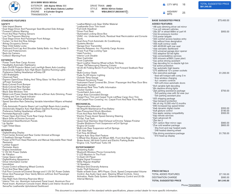 This 2018 BMW M550i blends luxury, performance, and everyday usability in a way very few sport sedans can. Finished in distinctive Alpine White with Black Dakota Leather, it delivers an executive presence paired with a twin-turbo V8 that produces effortless acceleration. With BMW’s xDrive all-wheel drive, adaptive suspension, and M Performance enhancements, the M550i offers exceptional confidence whether you’re carving mountain roads or commuting comfortably.