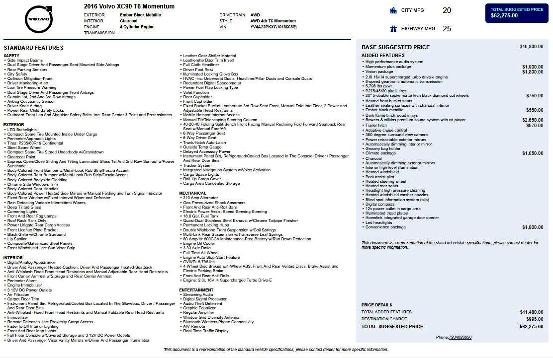 The 2016 Volvo XC90 T6 Momentum is a luxury midsize SUV that blends Scandinavian design with advanced technology and strong performance. Equipped with a 2.0L 16V I4 Supercharged Turbo Drive-E engine and 8-speed Geartronic automatic transmission, it delivers a refined balance of power and efficiency.