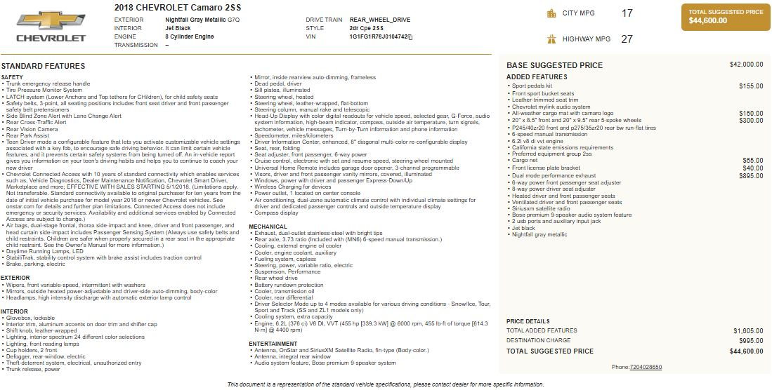 The 2018 Chevrolet Camaro 2SS embodies raw American muscle blended with modern technology. Designed for drivers who crave performance, it offers precise handling, striking styling, and a cabin packed with advanced features. With its 6.2L V8 engine paired to a 6-speed manual transmission, this Camaro delivers thrilling power and control, while its premium finishes and technology ensure comfort and connectivity.