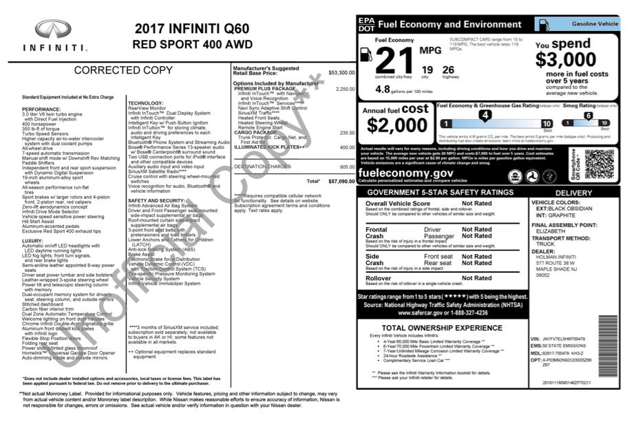Performance luxury and aggressive styling define this 2017 INFINITI Q60 Red Sport 400 AWD, a high-output sport coupe engineered for drivers who want sharp acceleration and premium comfort. Its 3.0L twin-turbo V6 delivers exhilarating power through a responsive automatic transmission and intelligent all-wheel drive system, providing confident traction and composed handling in a variety of driving conditions.