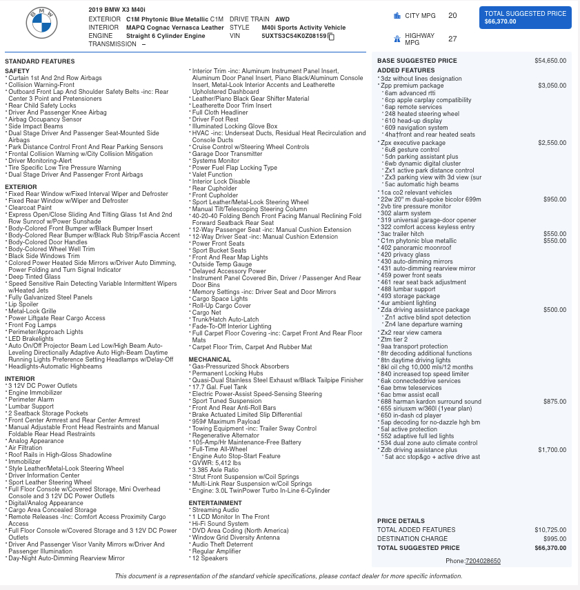 The 2019 BMW X3 M40i blends everyday practicality with thrilling performance, making it one of the most dynamic luxury SUVs in its class. Finished in striking Phytonic Blue Metallic with a beautifully appointed Cognac Vernasca Leather interior, this M40i presents a refined and athletic look from every angle. Under the hood, BMW’s renowned 3.0L TwinPower Turbo inline-6 delivers 355 horsepower, providing strong acceleration and smooth power delivery through an intelligent xDrive all-wheel-drive system.