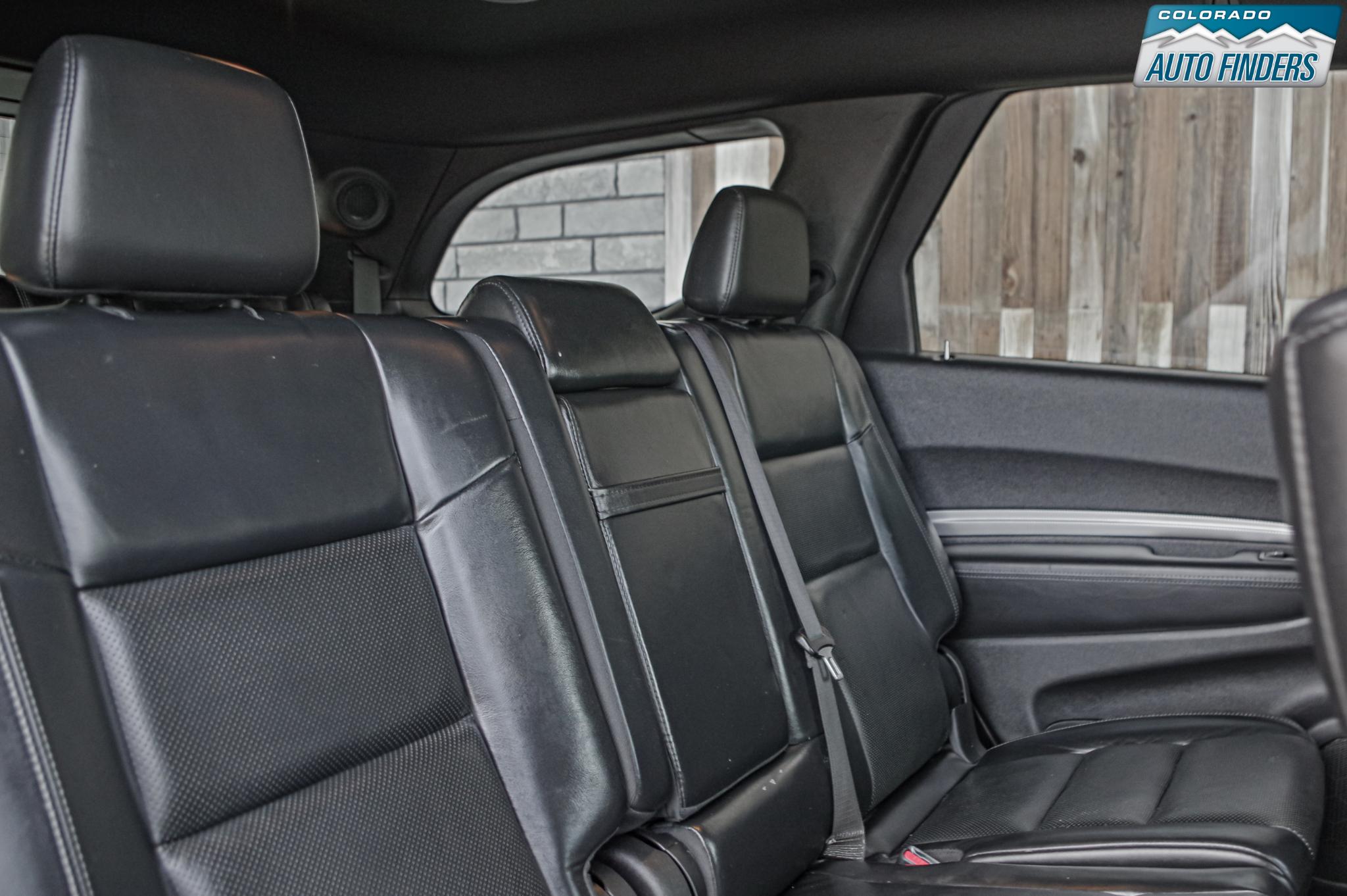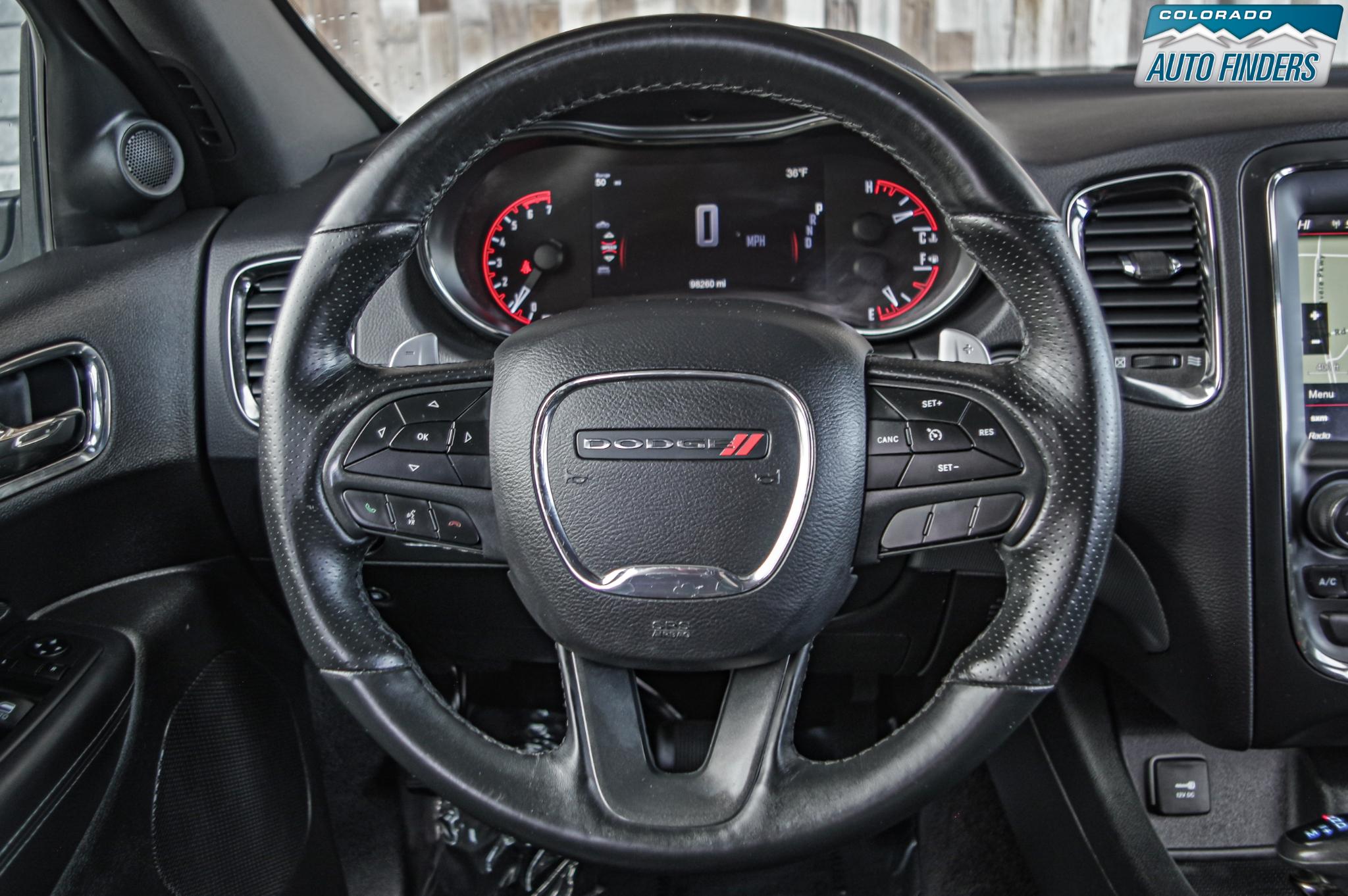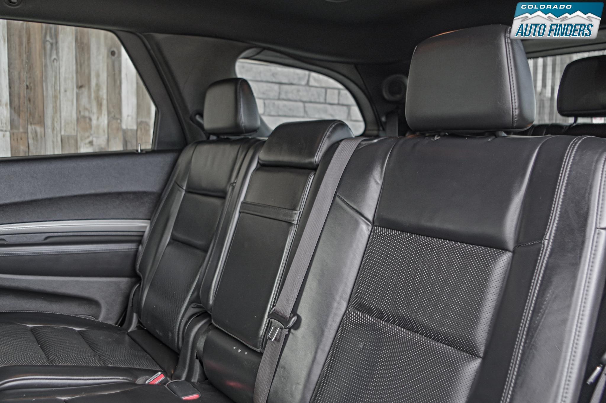 Inside, the Durango blends sport and comfort with leather and suede seating surfaces, heated seats, tri zone climate control, a premium touchscreen infotainment system with Bluetooth connectivity, navigation capability, and steering wheel mounted controls. The spacious three row cabin offers flexible seating and cargo configurations, making it ideal for families, road trips, or daily driving with extra gear.