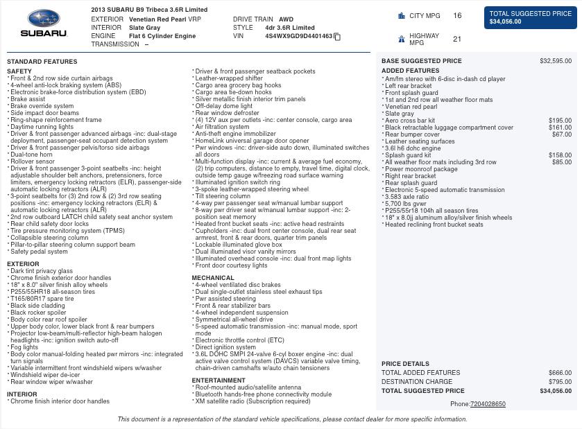 Finished in Venetian Red Pearl over a Slate Gray interior, the Tribeca presents an upscale appearance with 18-inch alloy wheels, roof rails, chrome exterior accents, and distinctive Subaru styling. The Limited trim adds premium touches throughout, making this an excellent choice for families seeking both utility and refinement.